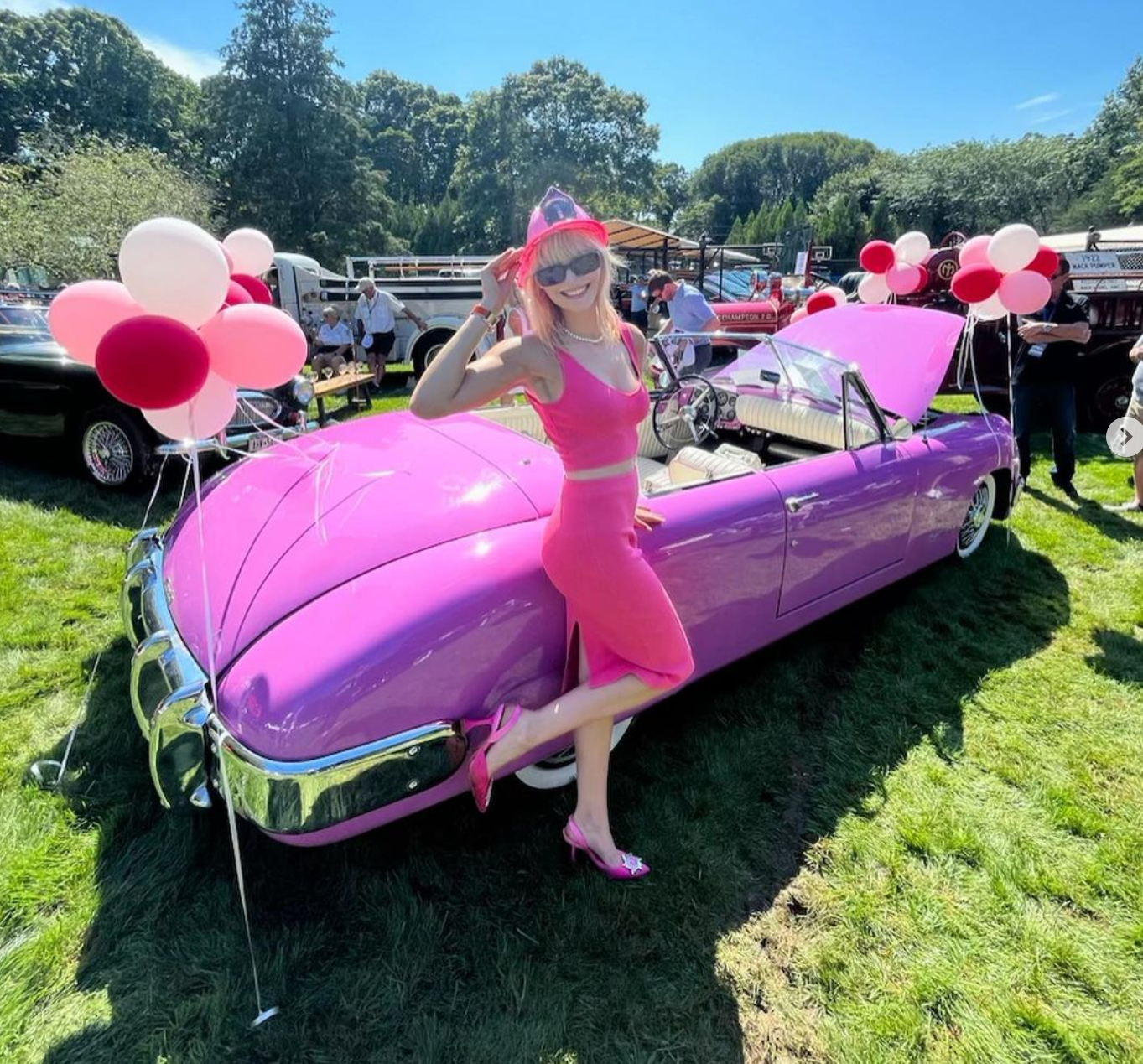That beautiful blond as Barbie is perfect, but the pink Muntz Jet is wrong, in the movie a pink ‘56-‘57 Corvette is the car with rear seat that never was for Ken.