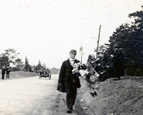 A pin and pennant vender at the Vanderbilt Cup Race.