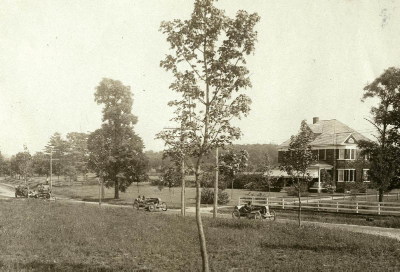 The three Frayer-Millers practicing on the 1906 course at the Hairpin Turn on Wheatley Road in Old Westbury.