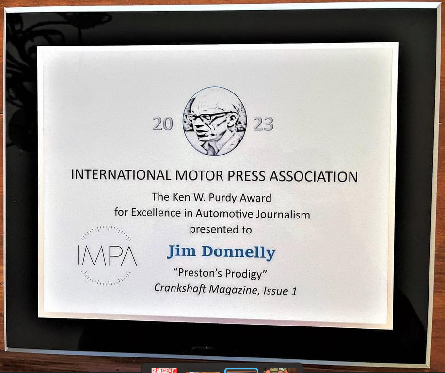 New York, NY, May 16, 2023 -- Veteran auto writer Jim Donnelly has been named this year’s winner of the International Motor Press Association’s (IMPA) Ken W. Purdy Award for Excellence in Automotive Journalism for “Preston’s Prodigy,” his engaging, in-depth story on Tucker1044 in the first issue of Crankshaft magazine.