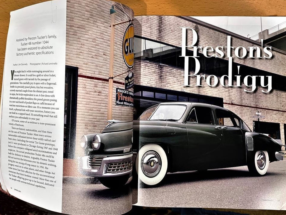 “Preston’s Prodigy,” appearing in Crankshaft’s inaugural spring 2021 issue, is 16 pages of text and photos documenting the painstaking restoration of the Tucker in record time to make its entry into the 2018 Pebble Beach Concours d’Elegance. Here are comments from the judges on Donnelly’s writing: