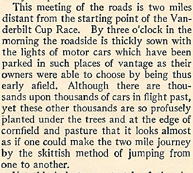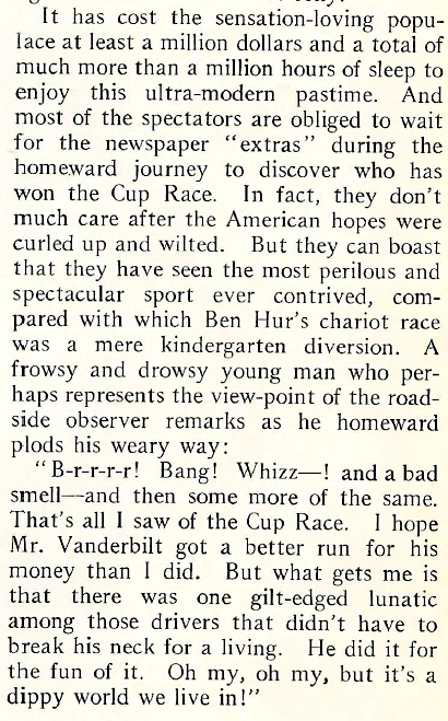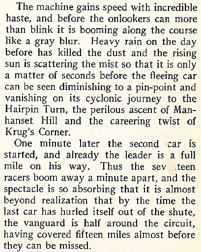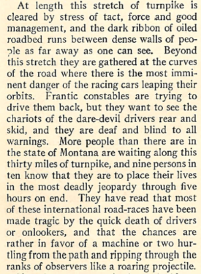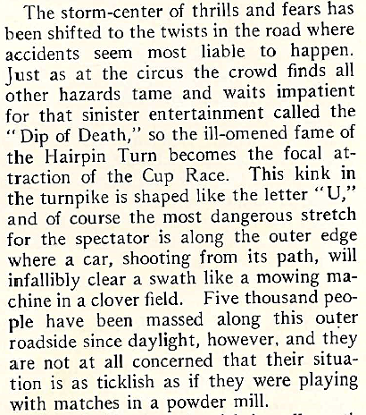 " . . . the ill-omened fame of the Hairpin Turn becomes the focal attraction of the Cup race", "Five thousand people have been massed . . . not at all concerned that their situation is as ticklish as if they were playing with matches in a powder mill."