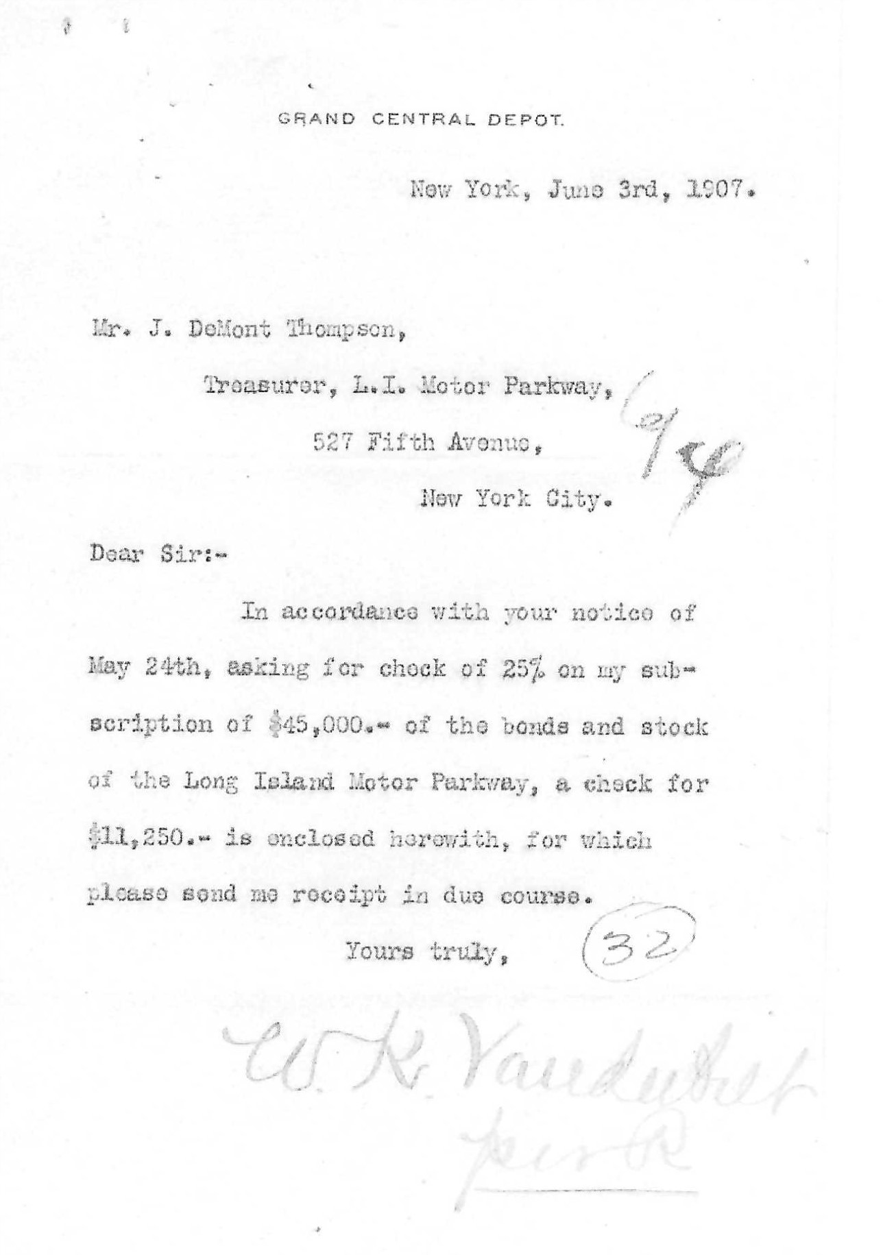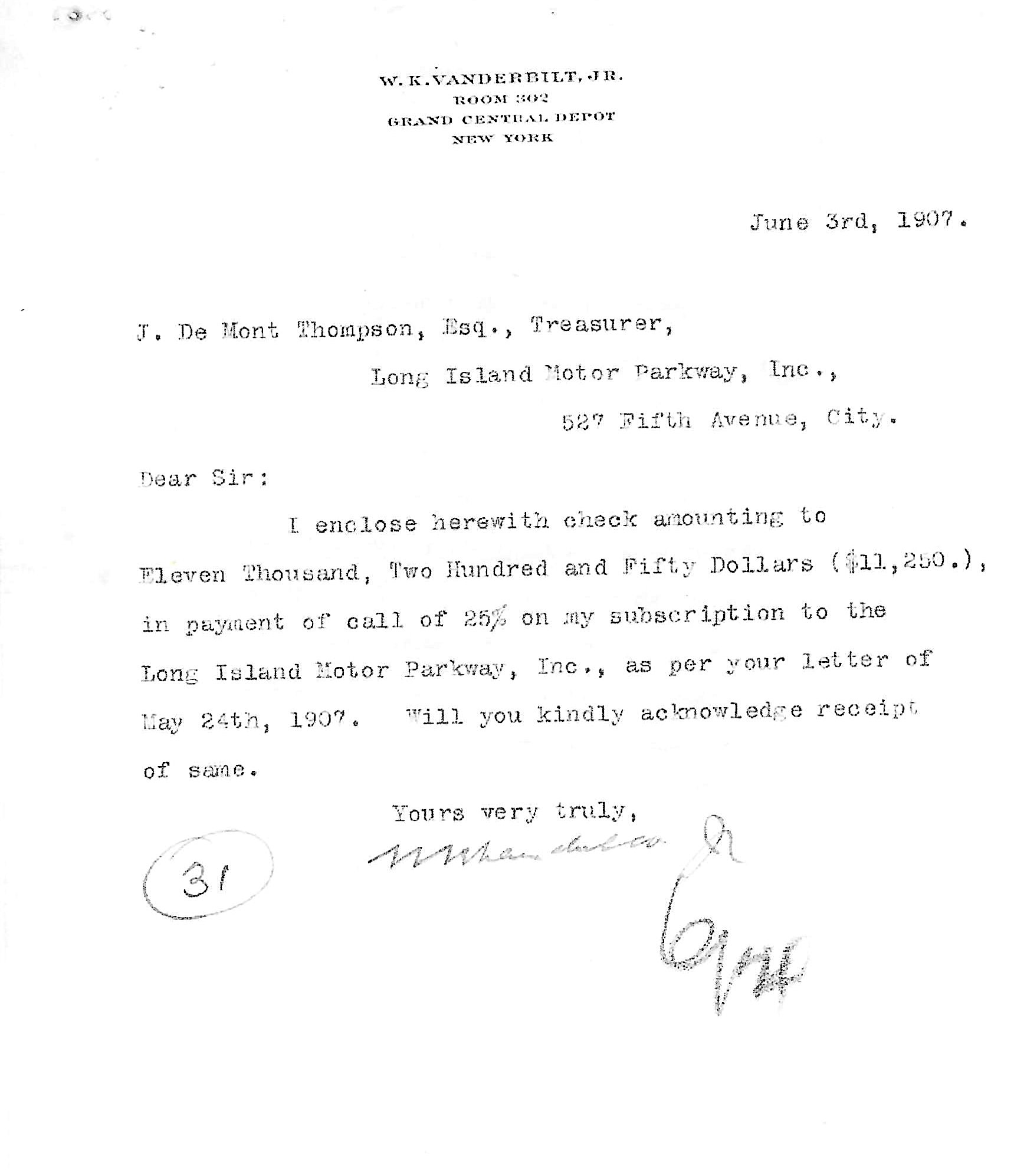 This is Wille K.s payment of $11,250, representing one quarter of his $45,000 total investment of stock in the Motor Parkway. According to other records listing subscribers and their investments, Willie's would grow over time.