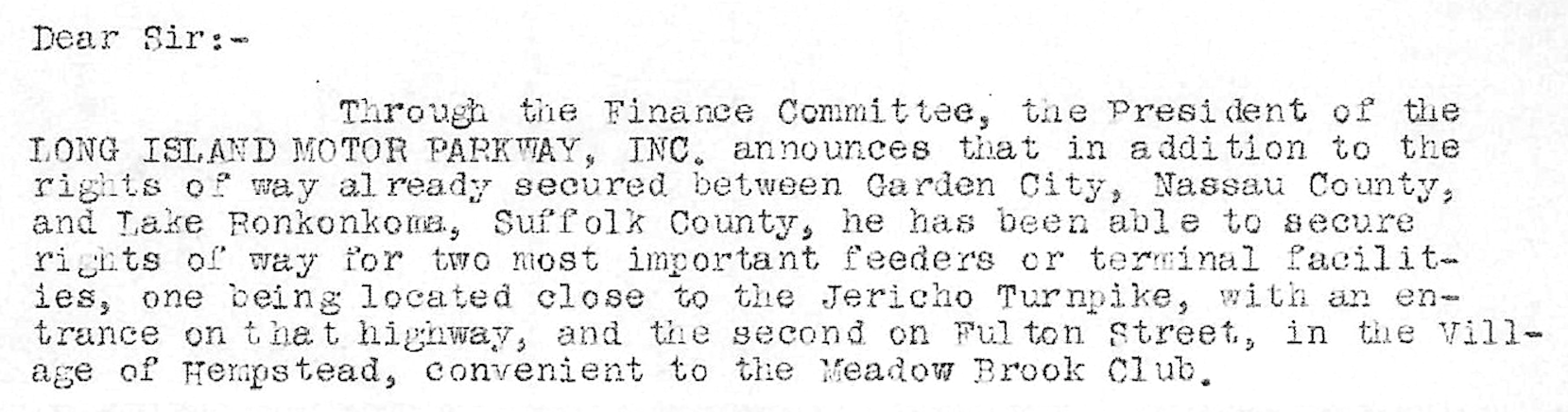 The letter requesting payment contained an update indicating obtaining rights of way for the Parkway and highlighted locations for "feeders" or "terminal properties": close to Jericho Turnpike and on Fulton Avenue in Hempstead.