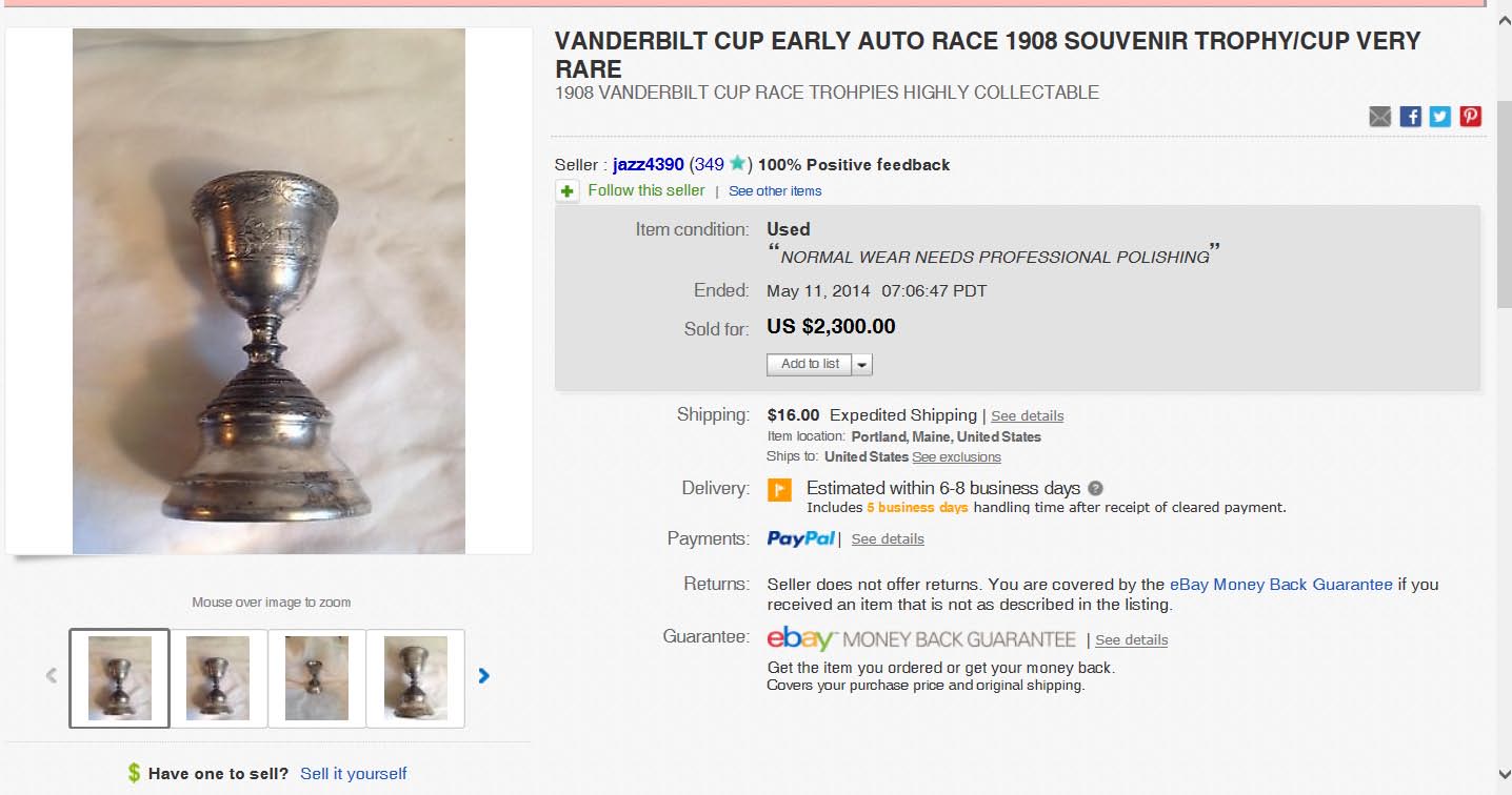 A Locomobile Vanderbilt Cup issued by the Locomobile to celebrate their victory in the 1908 race was sold for $2,300 on eBay earlier this month.
