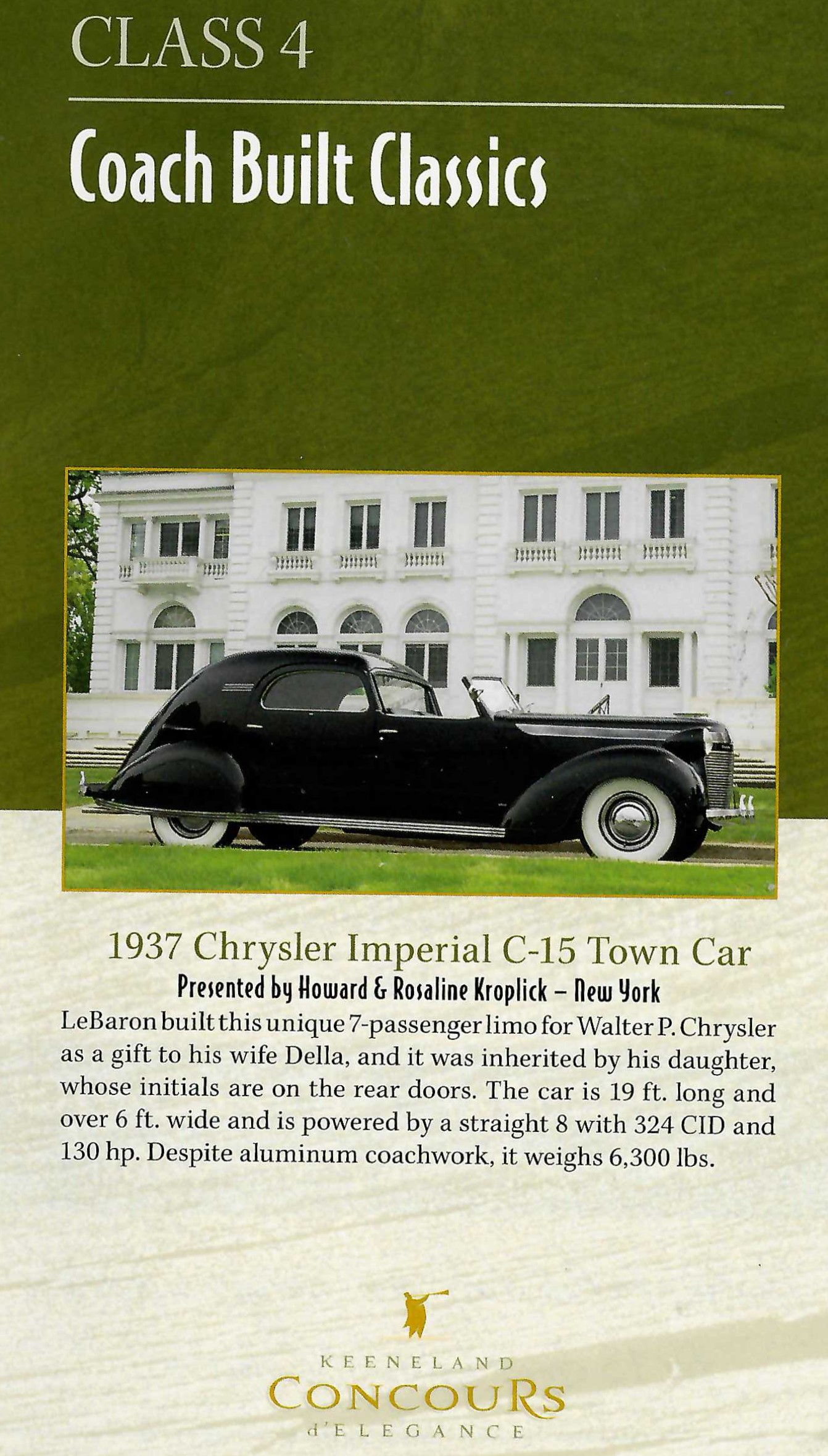 On July 17, 2016, Chrysler's Chrysler attended the prestigious Keeneland Concours d"Elegance in Lexington, Kentucky. Competition from other cars within the Class Coach Built Classics class was very strong and every car within the class was worthy of winning.
