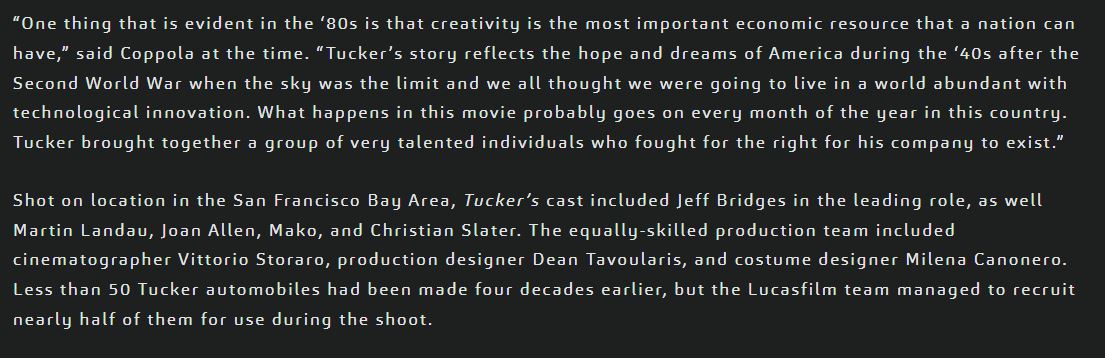 “One thing that is evident in the ‘80s is that creativity is the most important economic resource that a nation can have,” said Coppola at the time. “Tucker’s story reflects the hope and dreams of America during the ‘40s after the Second World War when the sky was the limit and we all thought we were going to live in a world abundant with technological innovation. What happens in this movie probably goes on every month of the year in this country. Tucker brought together a group of very talented individuals who fought for the right for his company to exist.”