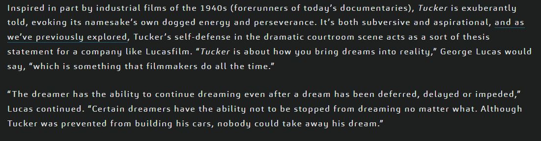 Inspired in part by industrial films of the 1940s (forerunners of today’s documentaries), Tucker is exuberantly told, evoking its namesake’s own dogged energy and perseverance. It’s both subversive and aspirational, and as we’ve previously explored, Tucker’s self-defense in the dramatic courtroom scene acts as a sort of thesis statement for a company like Lucasfilm. “Tucker is about how you bring dreams into reality,” George Lucas would say, “which is something that filmmakers do all the time.”