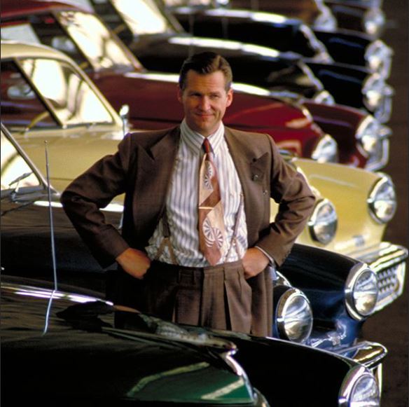 Jeff Bridges as Preston Tucker amidst some of the 22 authentic Tuckers used in the film.
