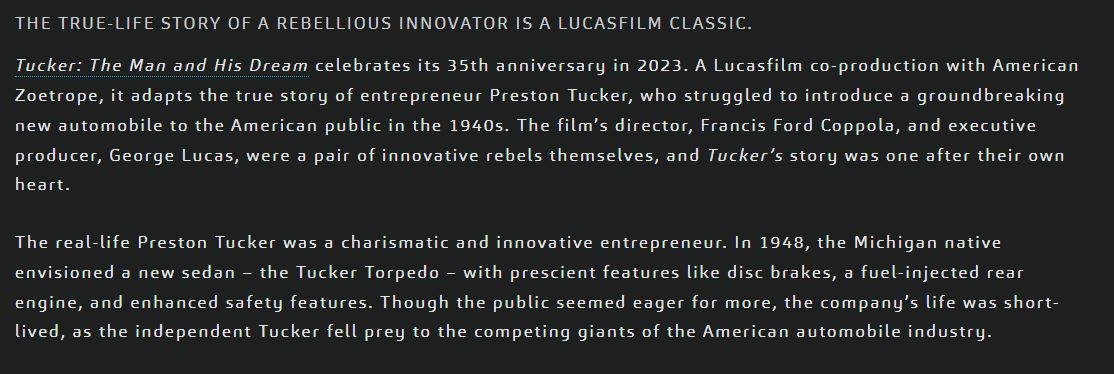 Tucker: The Man and His Dream celebrates its 35th anniversary in 2023. A Lucasfilm co-production with American Zoetrope, it adapts the true story of entrepreneur Preston Tucker, who struggled to introduce a groundbreaking new automobile to the American public in the 1940s. The film’s director, Francis Ford Coppola, and executive producer, George Lucas, were a pair of innovative rebels themselves, and Tucker’s story was one after their own heart.