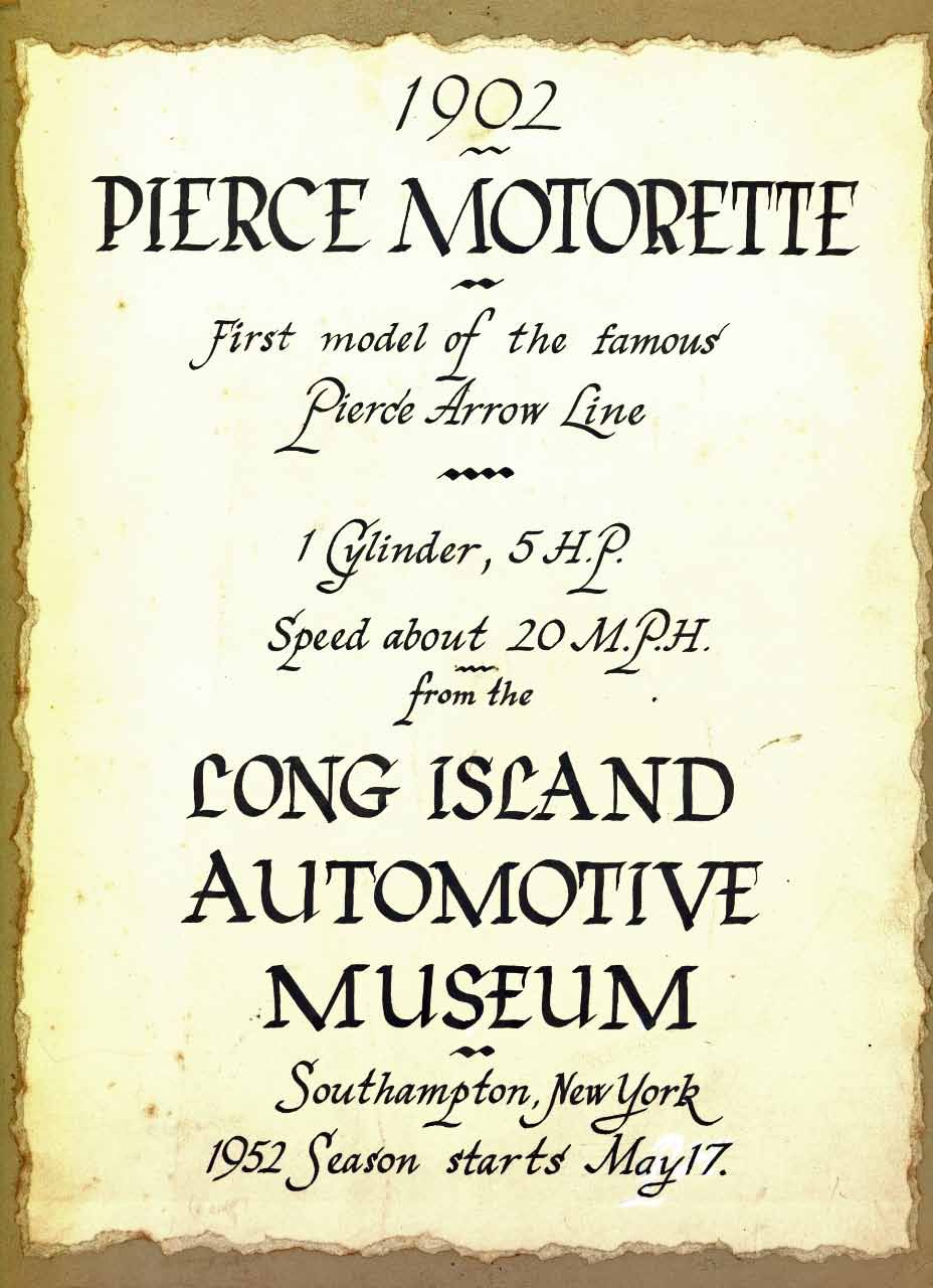 A poster for the 1902 Pierce Motorette that was shown in 1952.