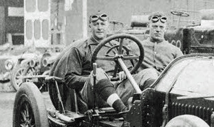 Was clueless but after a face match from this site, this could be driver Harry Grant/mechanician Frank Lee behind the wheel of Bette Noir. There’s a faded #8 on the grill (1908), so these daredevils could be preparing for the 1909 Vanderbilt Cup Race (#18)
