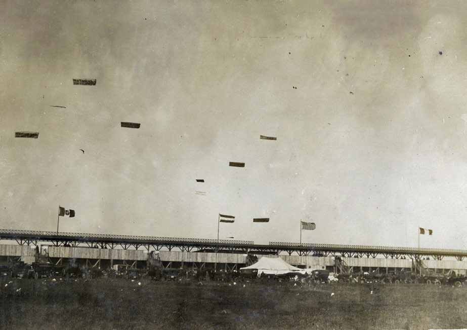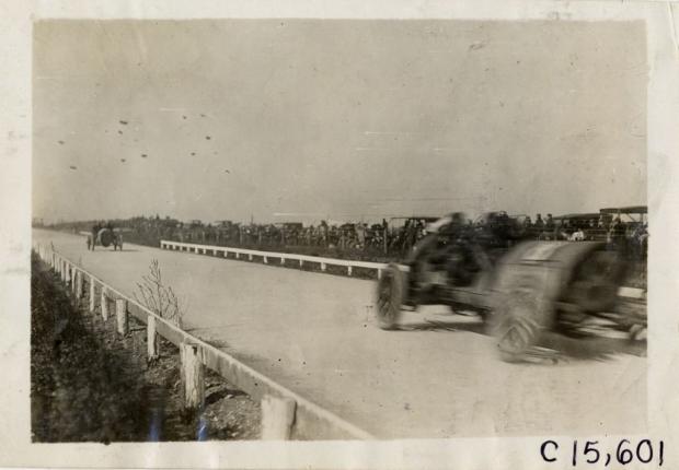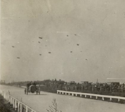 I think the race is the 1909 Vanderbilt Cup Race on October 30, 1909. The racers are the #8 Alco and the #9 Chalmers-Detroit. I think we’re looking west along the LIMP in area a little east of the start-finish line. A few guesses for the black spots: dirt on the negative or observation dirigibles or entrants in a kite flying contest. I believe the racers are probably on the first or second lap since they started in numeric order and probably would not be that close again throughout the race.