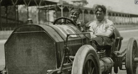 Unless I’m way off base, it sure looks like Harry Grant along with mechanician Frank Lee driving the Alco Black Beast during a test run prior to the first Indy 500 in May, 1911. The brick roadway helped with the track ID.