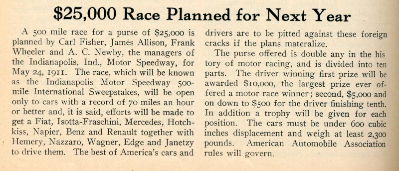 After resporting the September 1910 results, Automobile Topics published this article annoucing the race that would become the first Indy 500.