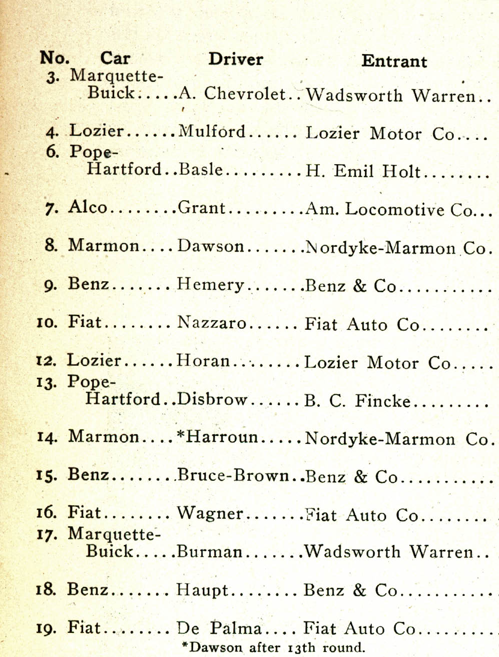 The curious thing is that there is an official photo from the Indianapolis Motor Speedway circulating with the Alco wearing number 18 . This photo shows a kind of starting line up, is clearly shot at Indy (the bricks!), but it cannot be the main event because of the number18 (Eddy Hearne on Benz had this number)!?