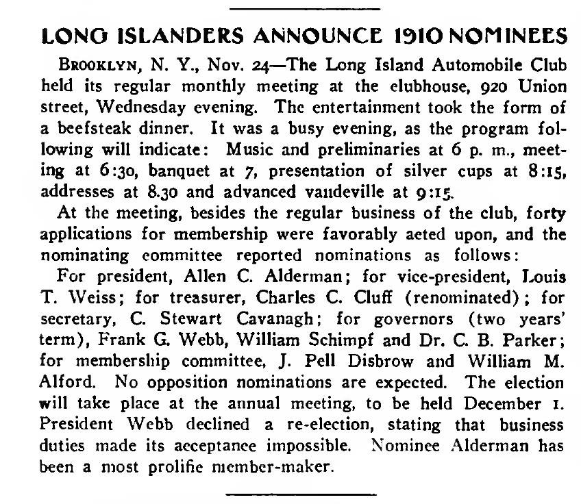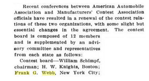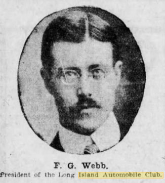 Frank G. Webb was the outgoing club president. He was a race official for the 1908 Vanderbilt Cup Race (Vice-Chairman of the Commission) and 1910 Vanderbilt Cup Race (A.A.A. Representative).
