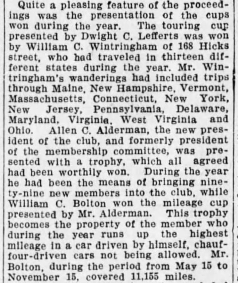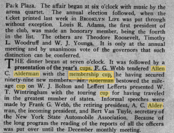The membership cup was given to Alderman for “having secured ninety-nine new members” for the New York State Automobile Association, of which he was the incoming President.