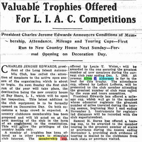 I think the trophy was sponsored by the Long Island Automobile Club and presented to Allen C. Alderman because he (as membership chairman?) had “secured the greatest number of new members” to join the club. It looks like the year 1909 is on the trophy and Alderman went on to become club president the following year. Frank G. Webb had been the vice chairman of the 1908 Vanderbilt Cup Race Commission (and now president of the L.I.A.C.) so maybe he somehow managed to get the 1909 V.C. R. winner, the Black Beast, engraved onto the trophy.