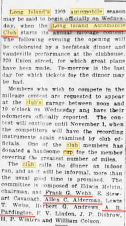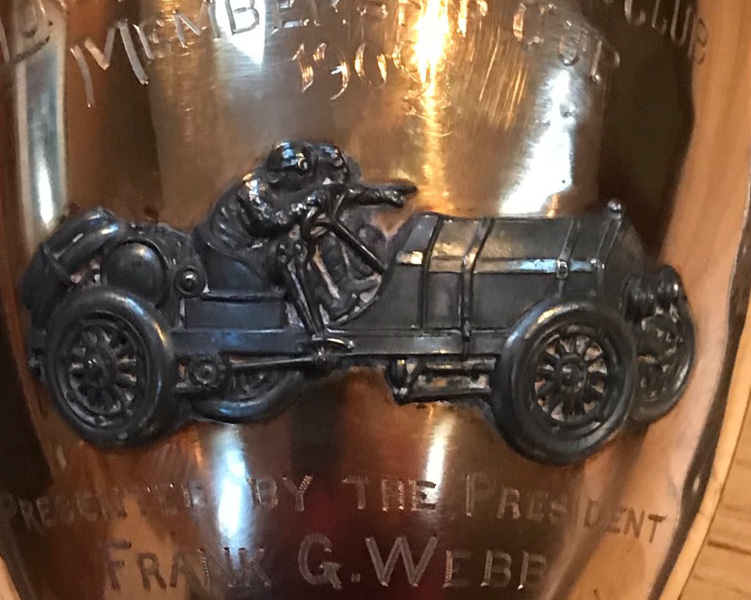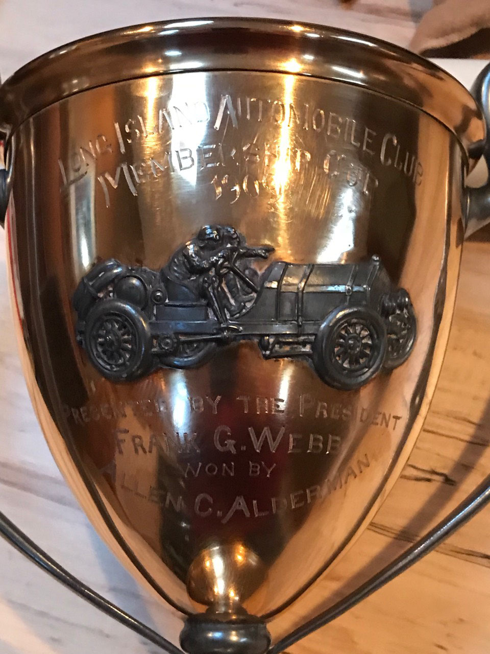 At the 1909 Long Island Auto Club dinner outgoing president Frank Webb presented this trophy to Allen Alderman for being the top recruiter. Frank Webb was an official at the 1908 LIMP Sweepstakes.