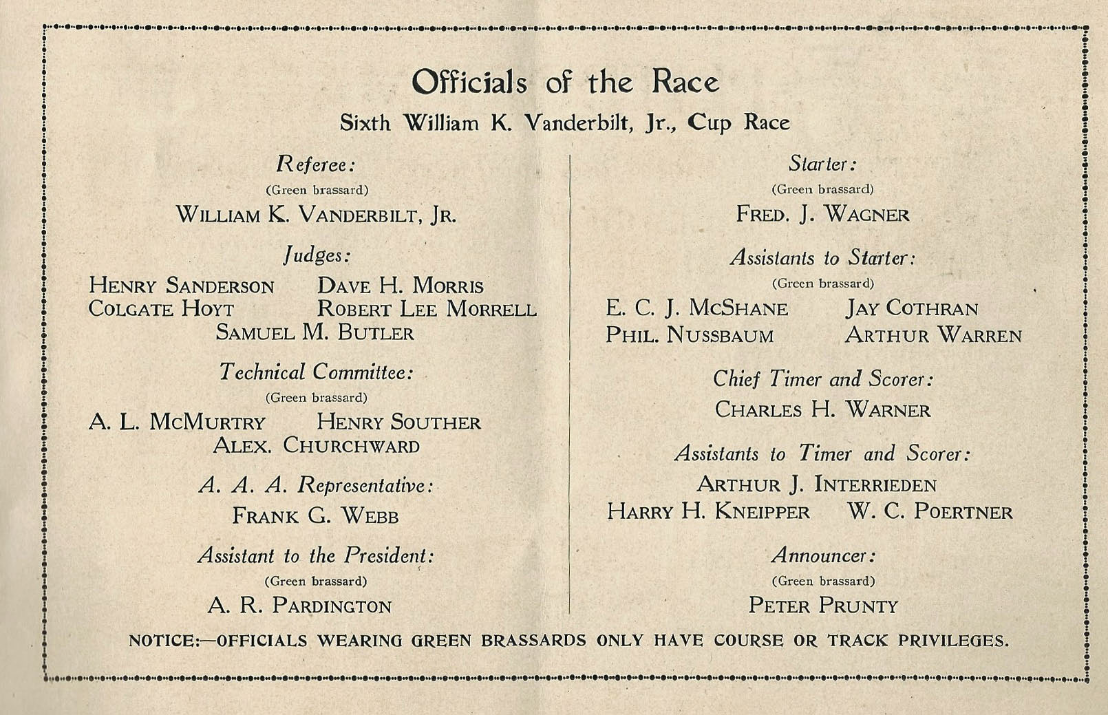 President of the Club and Vice-Chairman of the 1909 (maybe others) Vanderbilt Cup Race Commission. A.R. Pardington also was a director of the club.