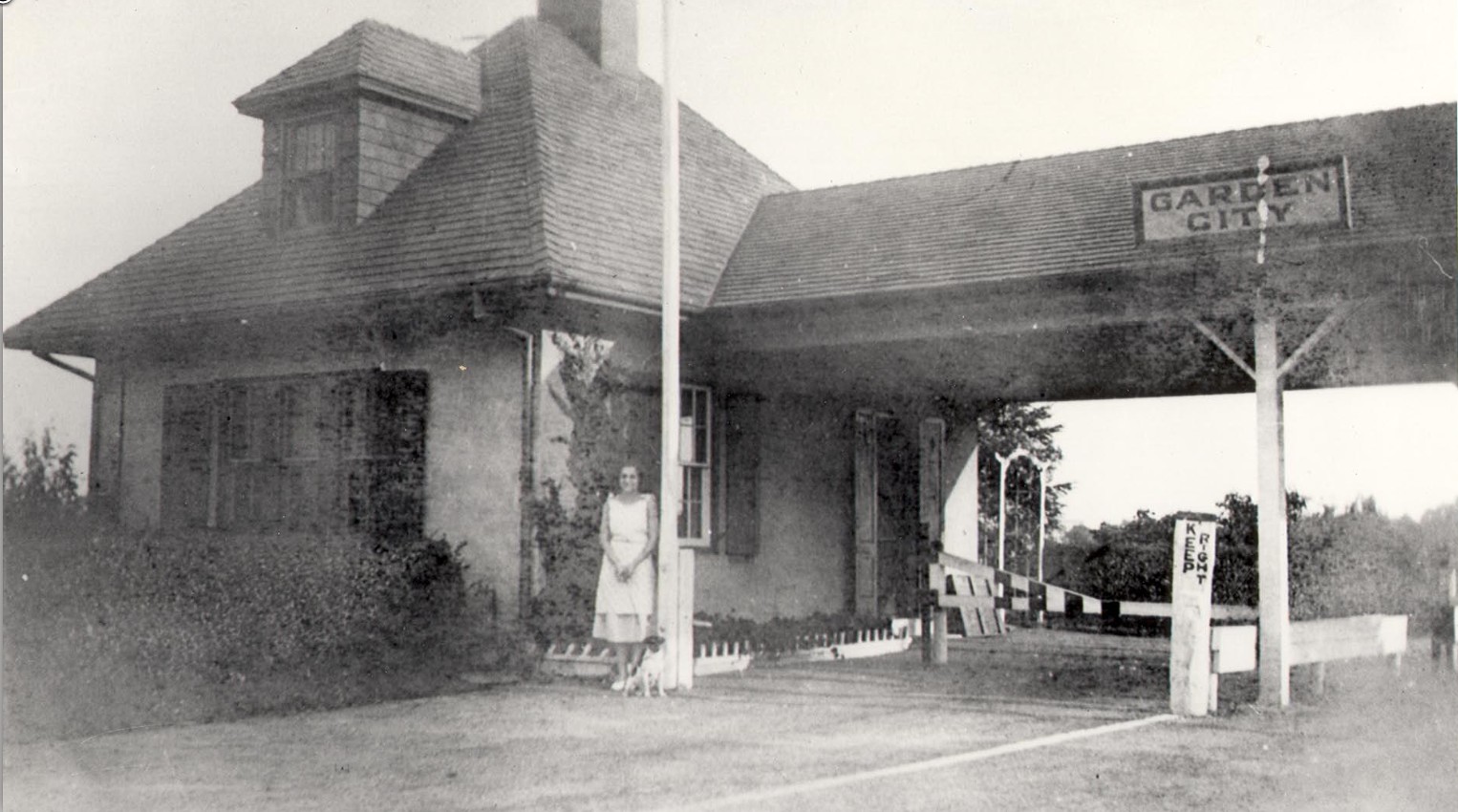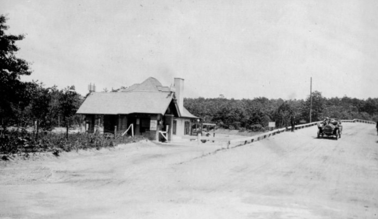 One of six original Motor Pkwy toll lodges, each designed slightly different. Two possibilities are the Great Neck lodge and Meadowbrook lodge, but the Great Neck lodge’s landscape is different while viewing in the opposite direction. The Meadowbrook lodge’s landscape seems a better match to the old Hempstead Plains.