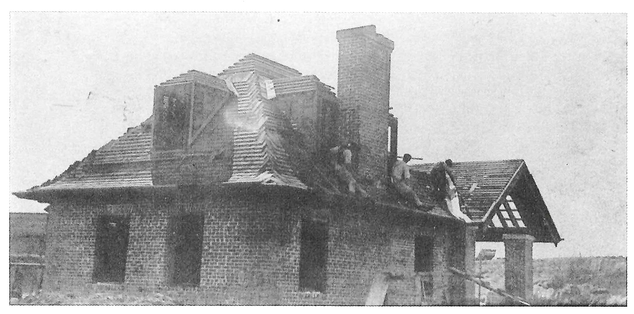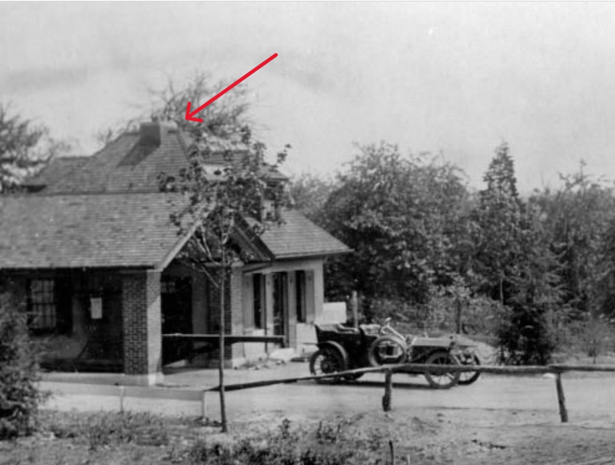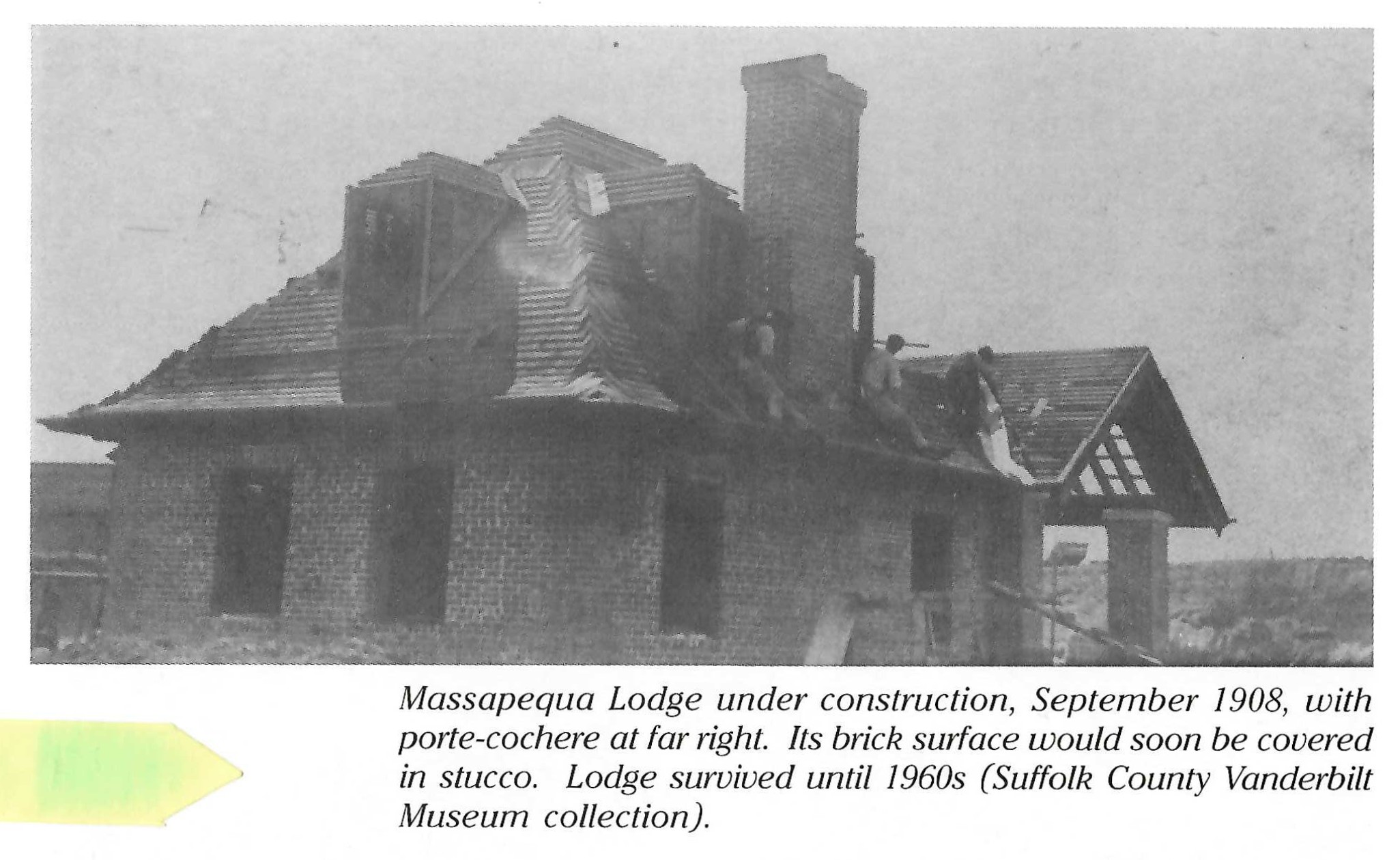 The Great Neck lodge (1909-1938) was built a few months later and nearly identical to the Bethpage Lodge in design and porte-cochere location. The one small detail is the chimney is in the center of the Great Neck structure and not one of the outside walls as shown by the red arrow.