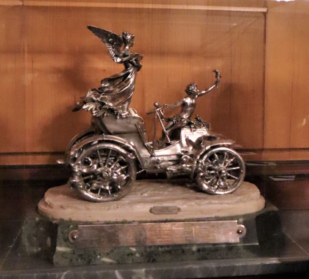 This is the Gordon Bennett cup race trophy. The car shown is a Panhard and it is steered by the Genius of Progress with the Goddess of Victory standing on the seat. It was designed by the jeweler Aucoc. Today it is located at the Gordon Bennett salon at the Automobile Club de France building, located on the Place de la Concorde in Paris. The Gordon Bennett race helped established the idea of a “closed circuit” race which links the types of races that William K. Vanderbilt Jr. organized.