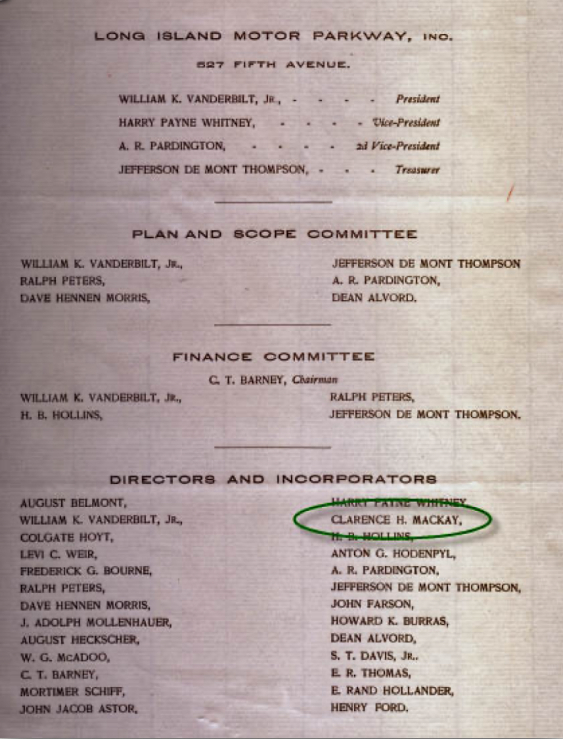 As listed in the 1906 prospectus, Clarence Mackay was an original director/incorporator of the Long Island Motor Parkway.