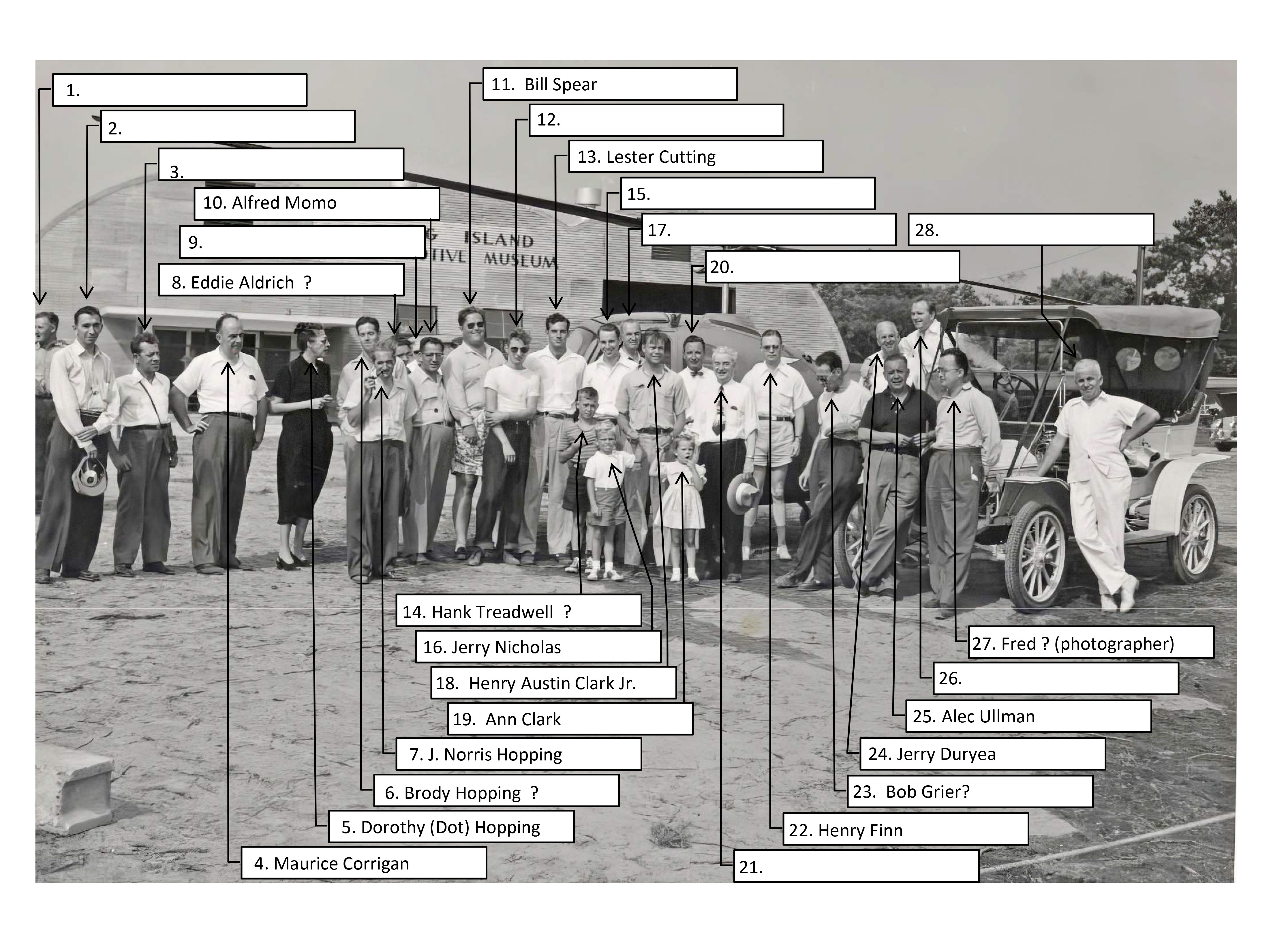 I think the photo was taken on August 27, 1948, at the grand opening of the Long Island Automotive Museum in Southampton, NY. The car could be a 1910 Buick Model 10. Person #18 is Henry Austin Clark, Jr.; #19 is his daughter Cynthia; #14 might be Jim Clark. That’s all I’ve got. Good luck to everyone.