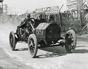 Ray Harroun driving the #21 Marmon during the 1910 Vanderbilt Cup Race. He finished 21st after breaking a crankshaft during lap 14.