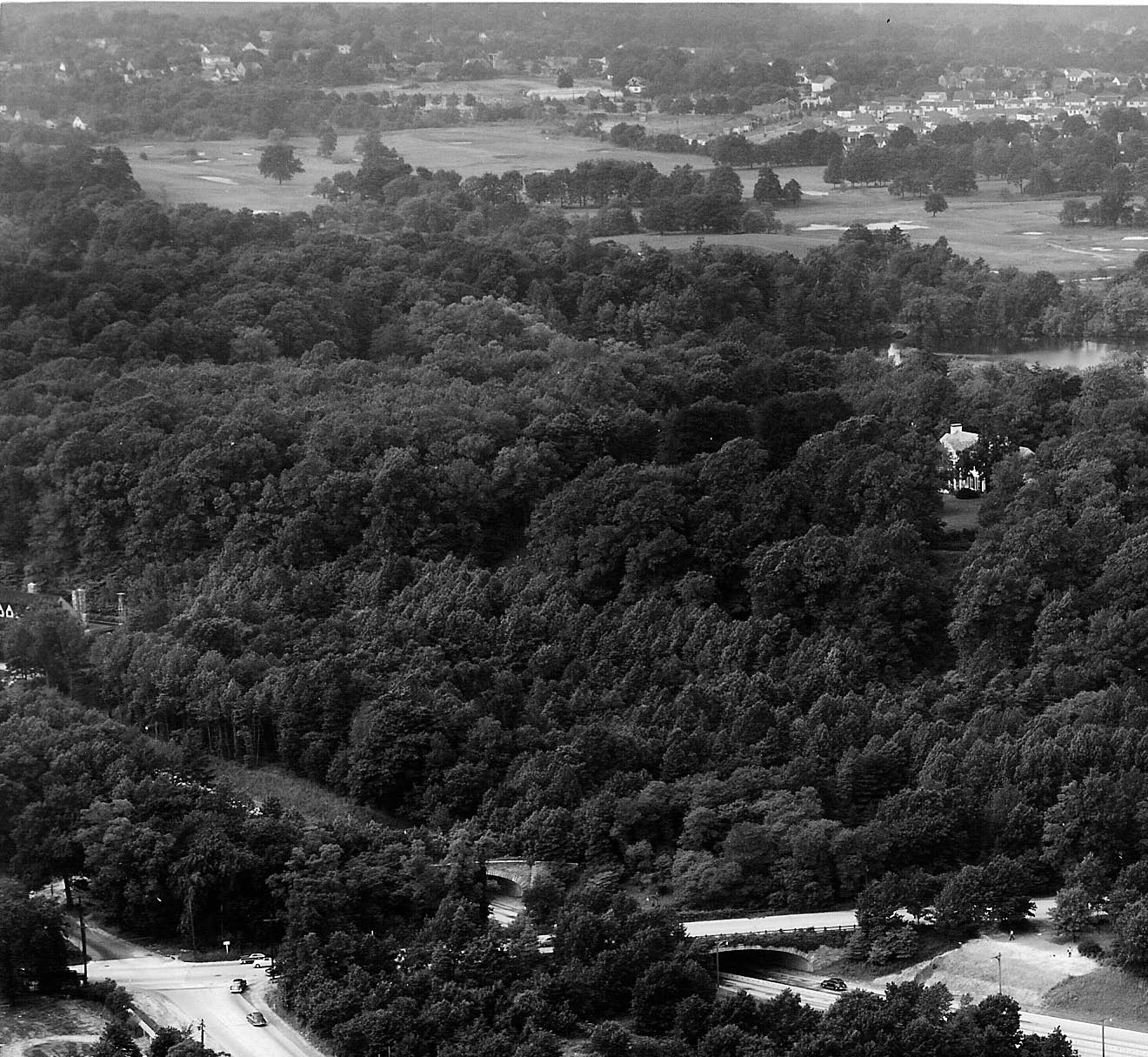 The Robert Moses' Motor Parkway Bridge over Northern State Parkway can be seen west of Lakeville Road. The Deepdale Mansion is on the right and the New York State Headquarters can be seen on the left.