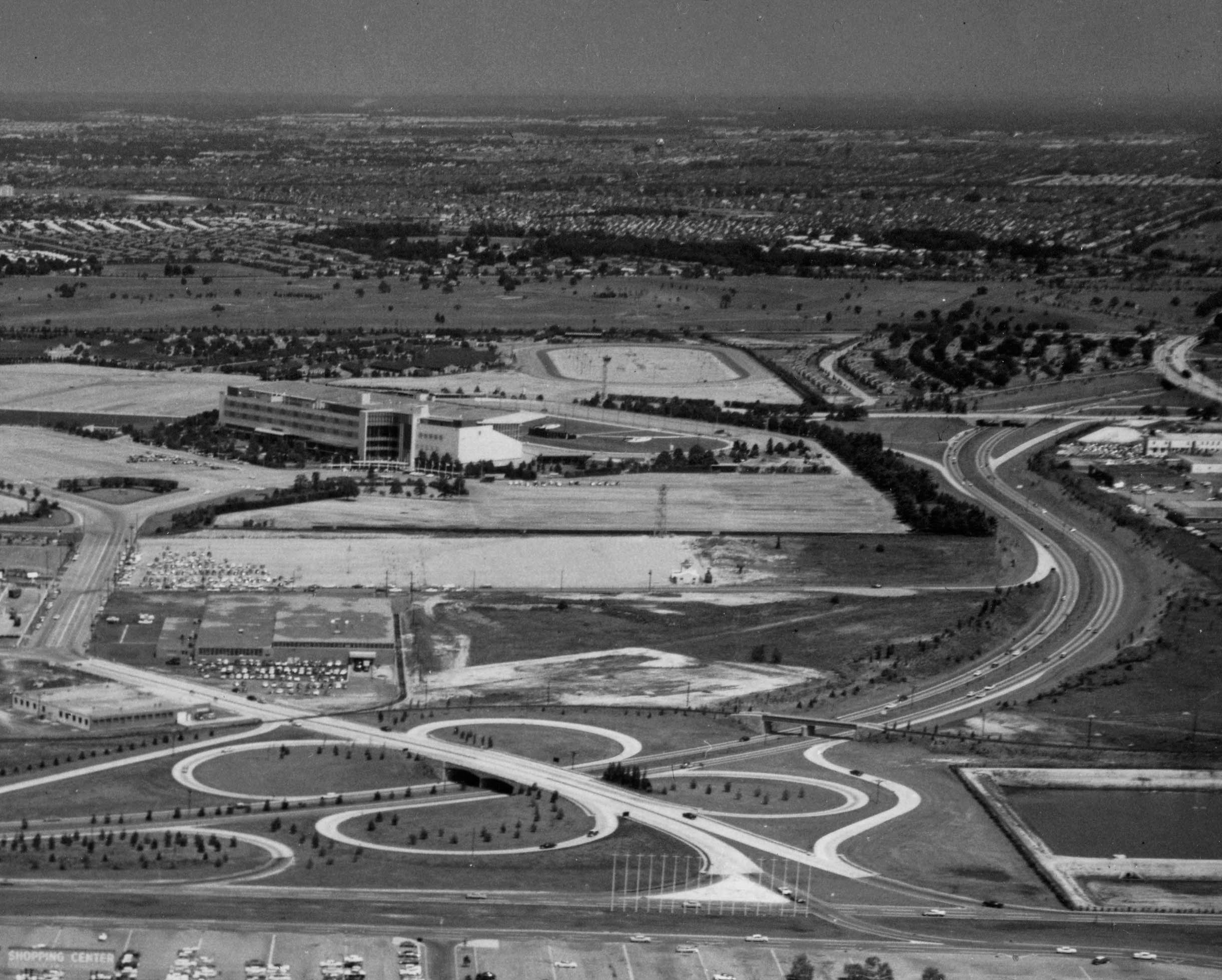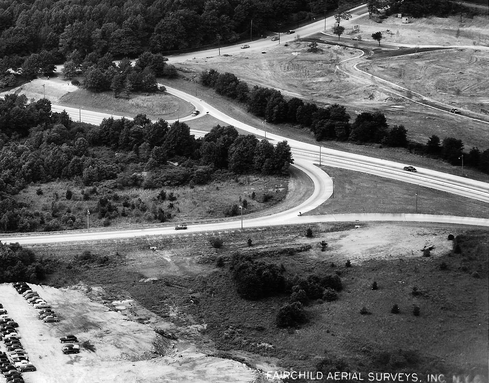 It is the exit off the Northern State by Lakeville Road. Lake Success is seen in the NW corner of the photo. On the left is Marcus Ave, the middle is Northern State Parkway. Running N-S is Lakeville Road with Great Neck to the North. The overpass west of Lakeville Road is for the Vanderbilt Parkway leading to the Vanderbilt estate. The UN met at the Sperry Plant in those days which is why the cars are parked there. Probably taken in the 1950s as when the parkway was widened the overpass for the Vanderbilt estate was taken down,