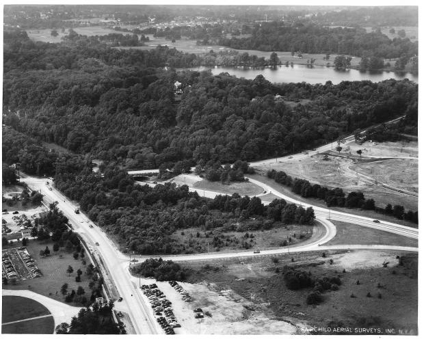 This is definitely Northern state pkwy and Marcus Ave in Lake Success.The parked cars are for the United Nations.The entrance off Marcus and circular drive are for the UN.The road running left to right in center of photo is Lakeville Rd.Orientation is looking North-North west. The estate hiding in the woods is Vanderbilt’s “Deepdale”.The body of water is Lake Success and beyond that is the Deepdale golf course.The UN was there from 1946-1952.The new roads off Marcus and North of the parkway are Tanners road and Olive street.