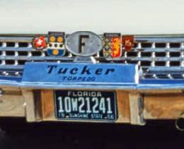 Looks like a 1958 Florida license plate so let’s assume 1958 and Florida as date and place. The plate number begins with “10” which at the time indicates Broward County where Ft. Lauderdale is. The owner of the Ft. Lauderdale Fairgrounds was a Nick Jenin who also owned 10 Tuckers and other Tucker parts and pieces in the 1950’s. Although “Tucker Torpedo” is on the rear bumper, that reference was only for early design and promotional use and not production so I’m thinking that Jenin built a Tucker from parts and painted it to suit his own preference. Chassis number may be unknown. Mostly all guesswork but that’s all I’ve got. As to the badges - no clue.