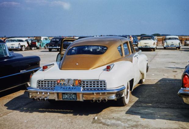Tucker Torpedo (only 50 made). The photo was taken in Florida, there is more than one FL plate parked in the lot. Appears to be around the ‘50s but the photo quality is too good. This may be a more recent auto show.
