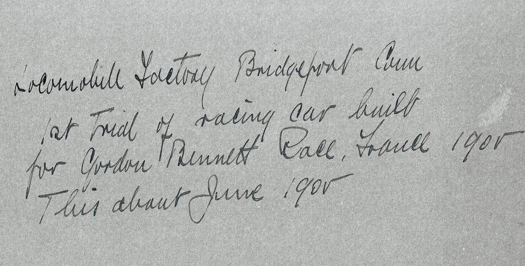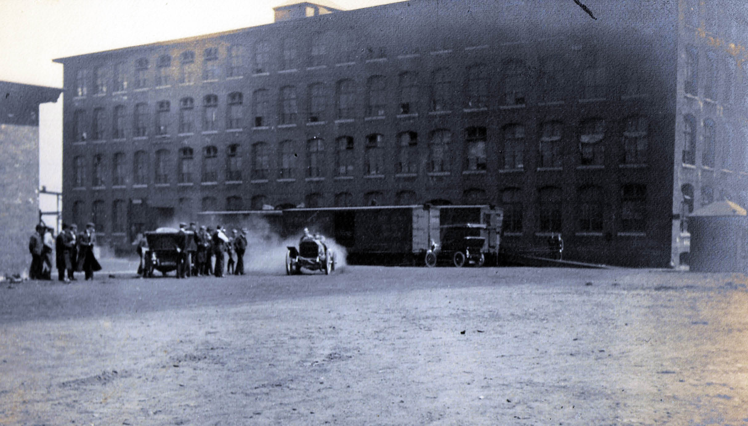I’m fairly certain that’s the Locomobile factory in Bridgeport, CT. so the car is probably a Locomobile. The rest is just a series of educated guesses. Since the photo is from the Helck collection, could that be Joe Tracy driving in September of 1906 in preparation for the 1906 American Elimination Trials?
