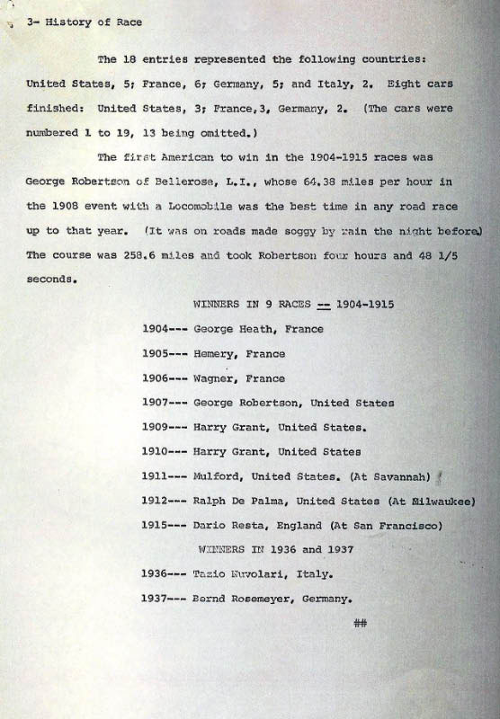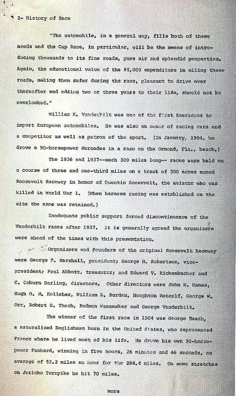 The race took place at the SCCA New York Region’s new road circuit on the Roosevelt Raceway’s grounds. The course utilized a portion of the parking facilities and access roads for a harness racing track. The 11-turn, 1.5 mile course included a straightaway nearly one half mile in length.’