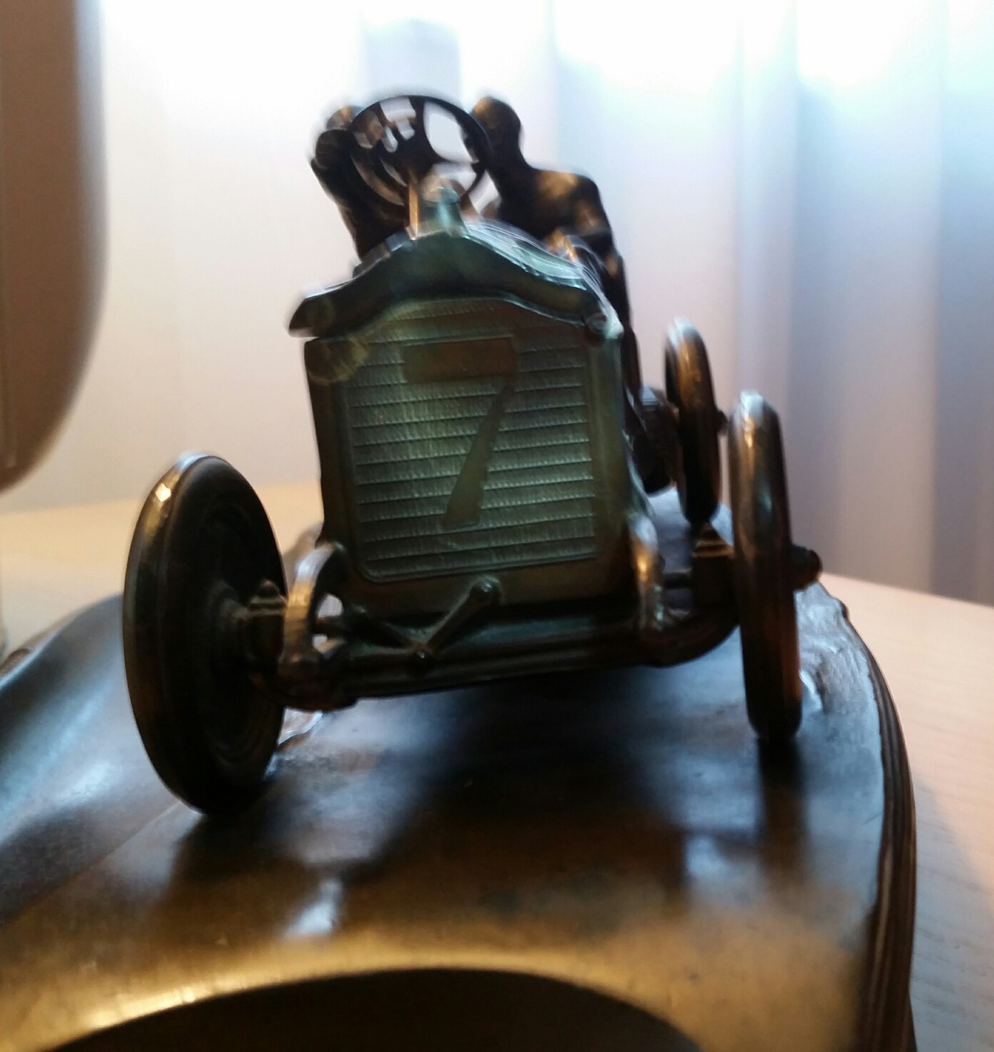 The bronze probably shows the winning combination of the 1906 Circuit des Ardennes: Arthur Duray on a Lorraine-Dietrich with number 7. About the artist I wouldn’t know, but I guess it was not a prize but just an ‘objet d’art’ for daily use. Such objects were indeed rather popular during these days and are very valuable now if original.
