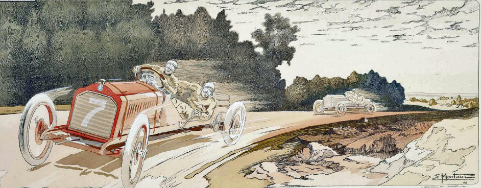 The racer was identified as a Lorraine-Dietrich. It is likely the #7 Lorraine Dietrich driven by Belgium born Arthur Duray that won the Circuit des Ardennes held in Belgium on August 13, 1906. Duray competed with this Lorraine-Dietrich in the 1906 Vanderbilt Cup Race finishing third. Duray also raced in the 1905 Vanderbilt Cup Race driving a DeDietrich to ninth place.