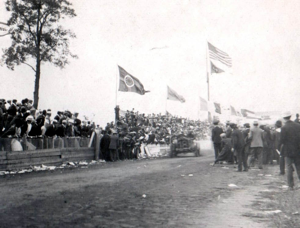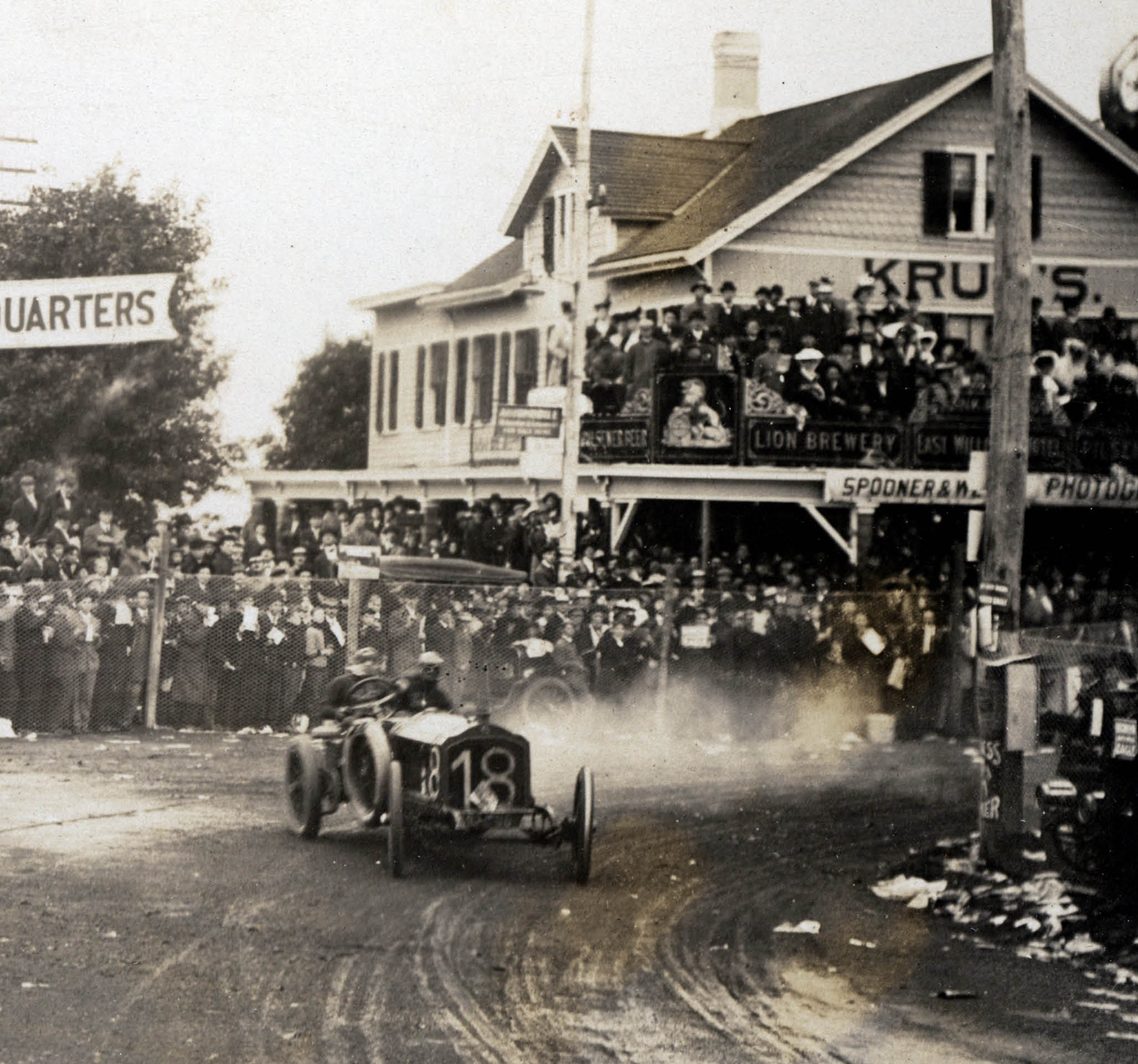 One of the stirring moments that built the legend of the Vanderbilt Cup Race thrilled the crowd at the “Hairpin Turn.” A spare tire and rim strapped to the back of the #18 Lorraine-Dietrich broke loose and began to thrash the gas tank. Riding mechanician Franville clutched the heavy mounted tire and lost his balance. Just as the car skidded through the turn, the driver Arthur Duray handled the tight corner with one hand on the wheel while rescuing his assistant with his left arm.