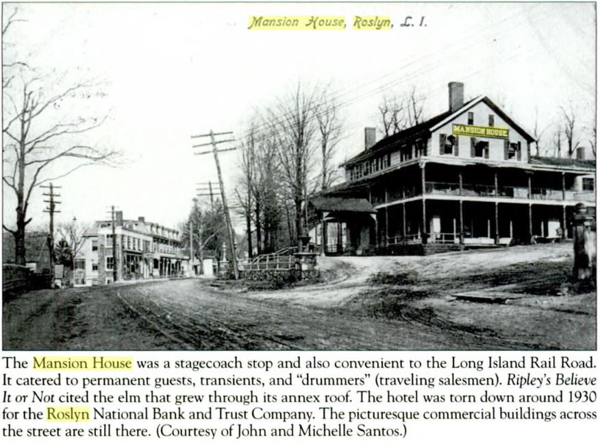 The Mansion House was built around 1860 on the southeast corner of Remsen Avenue (then Mansion House Road) at 1432 Old Northern Boulevard, Roslyn.