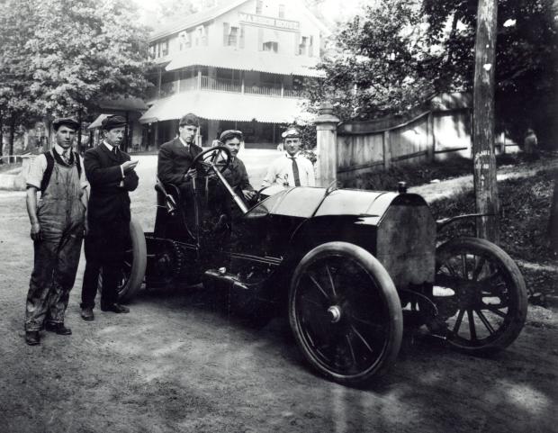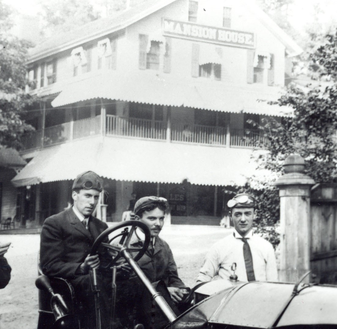 That’s the 120 HP Mercedes racer driven by Albert Campbell. It had been originally assigned number 13 for the 1905 Vanderbilt Cup Race on October 14, 1905 but actually raced as “X” since the team considered #13 to be unlucky. The photo location is in front of the Mansion House hotel at 1432 Old Northern Blvd. on the corner of Remsen Avenue in Roslyn. That hotel was the headquarters for the Mercedes “X” team.