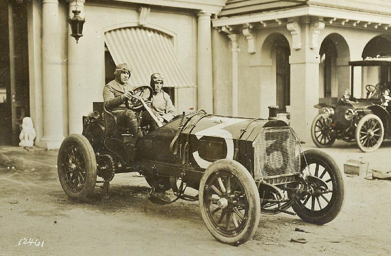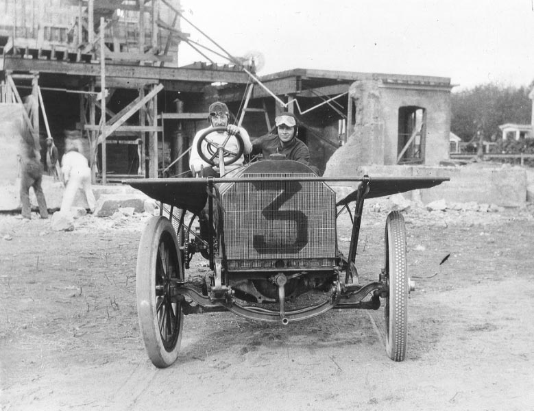 Driver Camille Jenatzy in the #3 Mercedes in front of the collapsed garage.