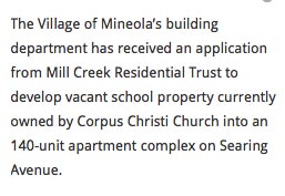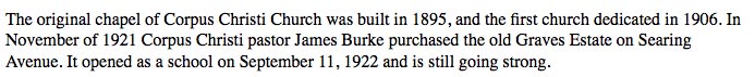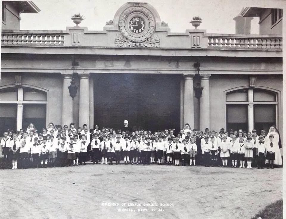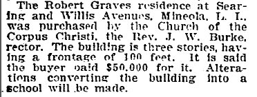 Corpus Christi School on Searing Avenue and west of the Oyster Bay LIRR tracks in Mineola. In November 1921, Pastor James Burke purchased this property for $50,000 from the estate of Robert Graves.