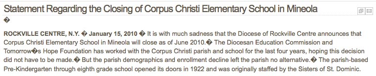 The Corpus Christi School as it looked when it was closed by the Diocese of Rockville Centre in June 2010.