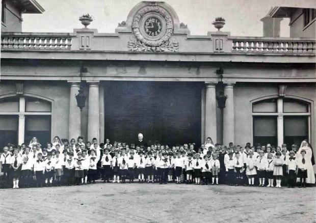 The 125 students of the first classes of the Corpus Christi School. The students are with the Sisters of Saint Dominic who staffed the school The first princpal of the school, Sister Flora, can be seen in the middle of the photo.