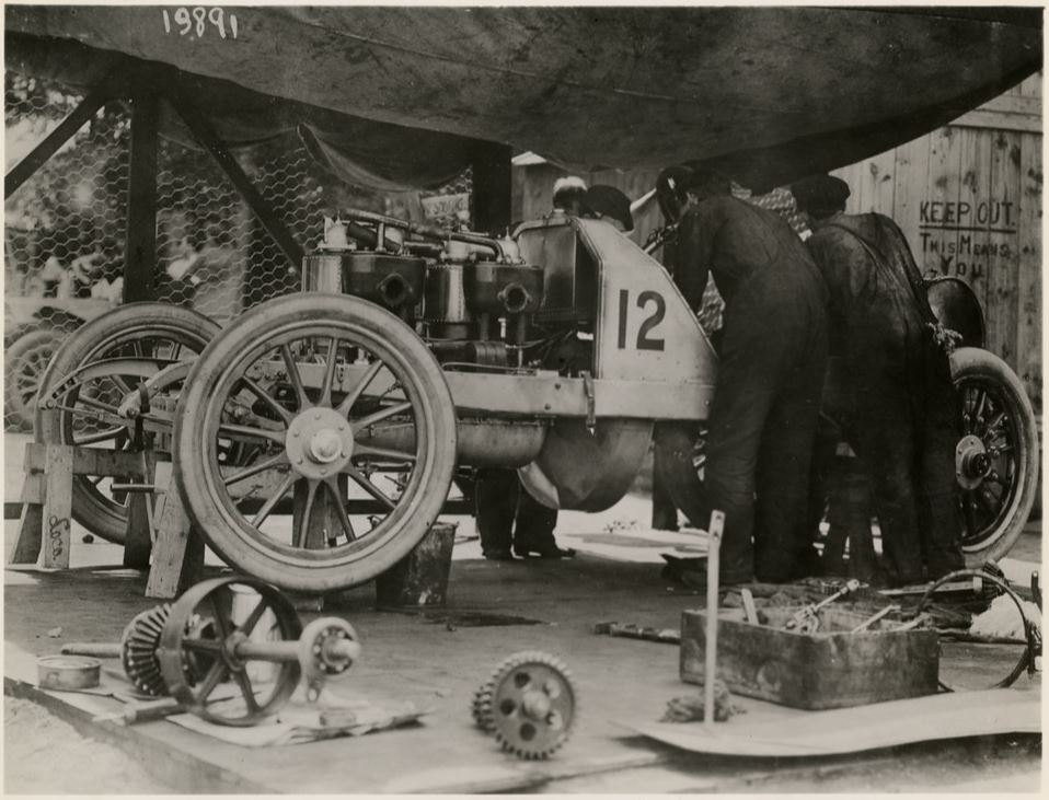 Car being prepped for the 1906 American Elimination Trial and assigned to driver Joe Tracy. Date of photo is September 21, 22, 1906. The other racer at the same location was a twin of the number 12 Locomobile which would be a back-up car in the event of problems with the first number 12.