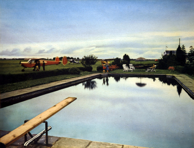 Pool at the Long Island Aviation Country Club In Levittown looking east. Right across the parkway from the grandstands and the pits for the cup races. Jerusalem Ave bridge would be just off past the hangars in the distance. Charles Lindbergh was a member and taught his wife to fly here. Early 1940’s on account of the color photograph and the aged landscape?