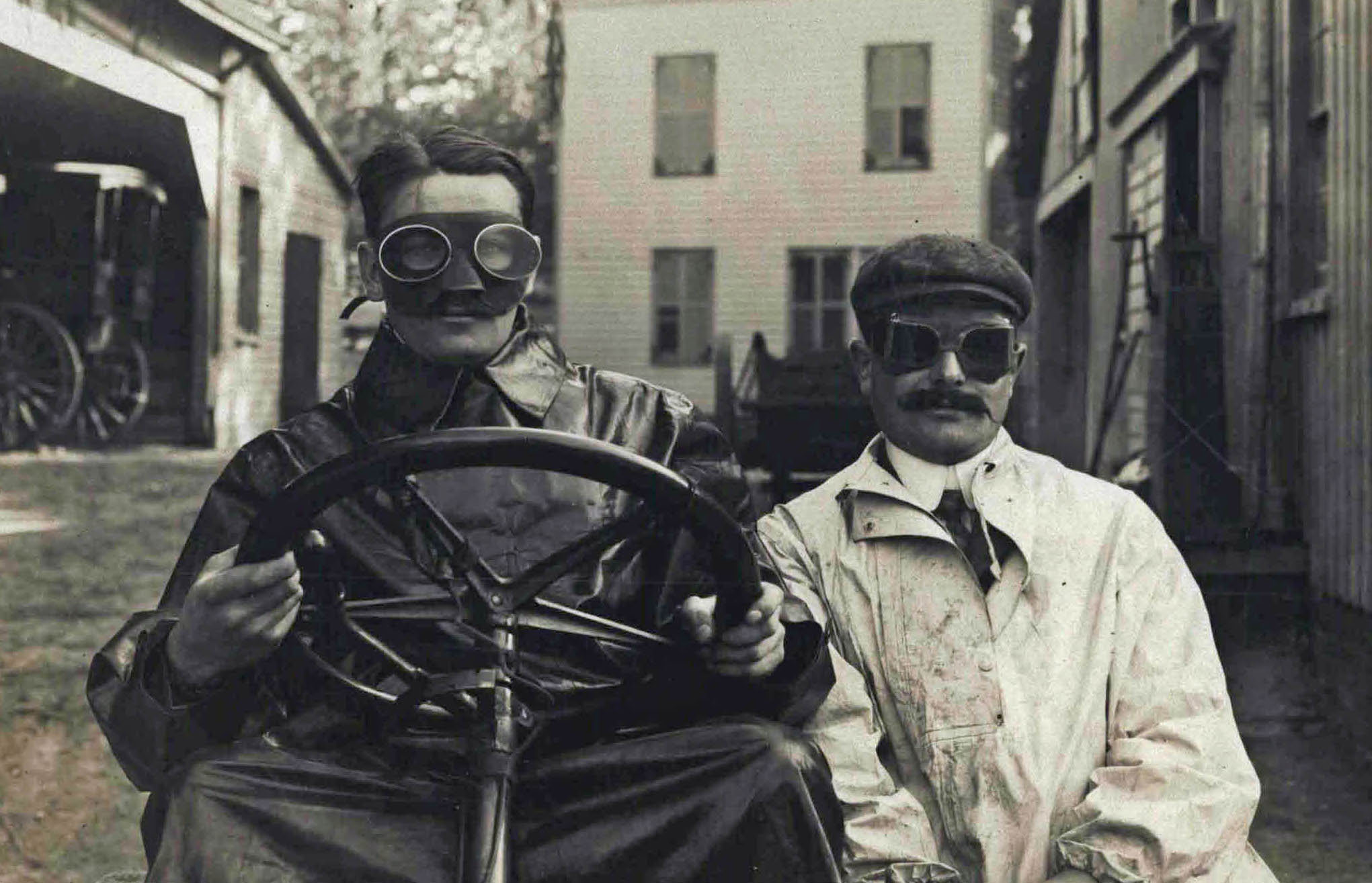 This is like trying to identify The Lone Ranger with his mask on but I’ll try to connect the dots anyway. Since this photo is from the Helck collection, and since Peter Helck did some artwork picturing the 1906 V.C. Races, which driver/mechanician pair had decent moustaches in 1906? I’m guessing Gustave Caillois and Marcel Pouxe who were part of the Thomas Flyer team. Maybe the photo was taken on the grounds of Krug’s Hotel in Mineola, which was the Thomas Flyer headquarters.